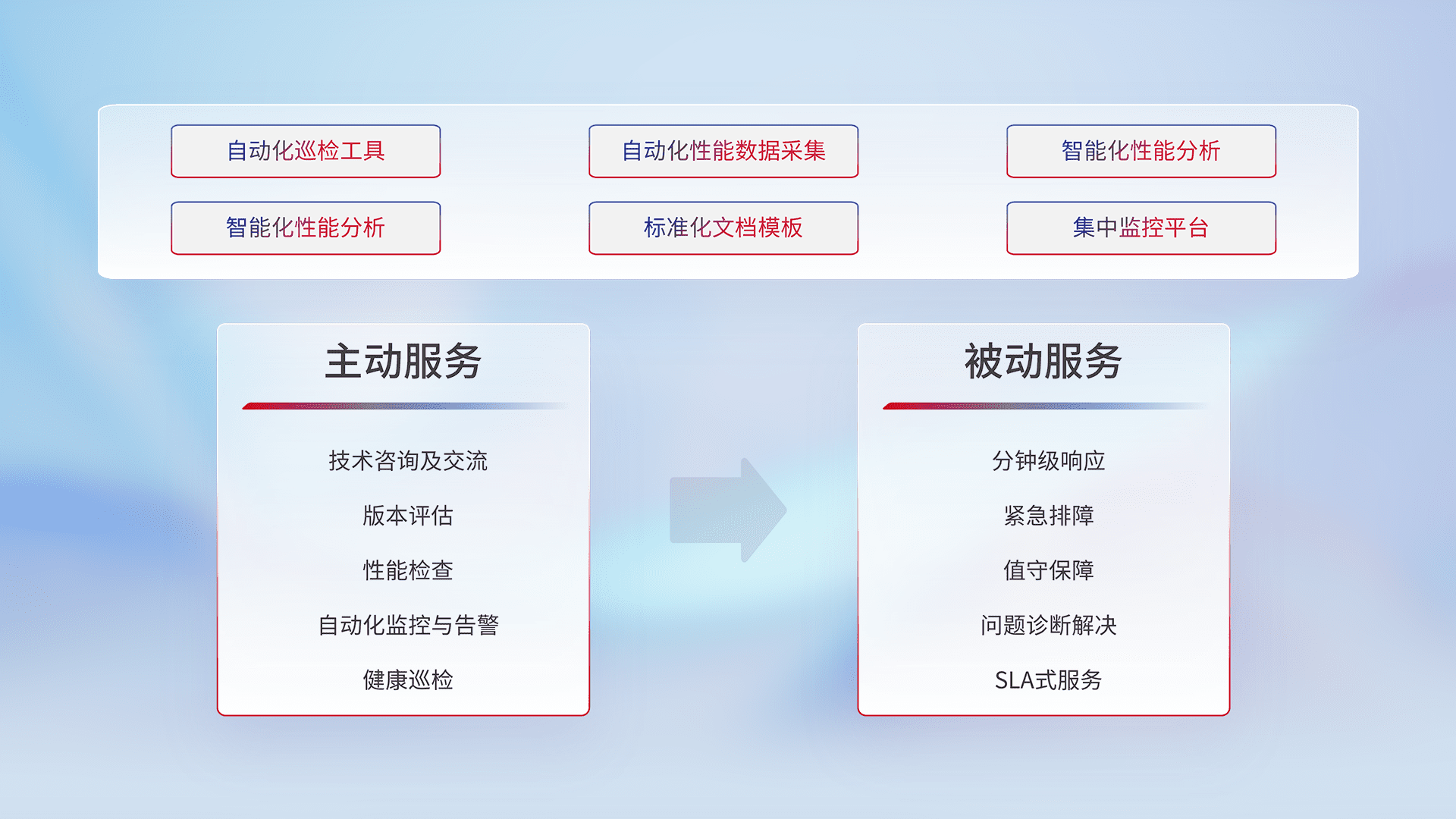 智能化工具和标准化文档,,,,保障服务质量,,提供主动服务(包含技术咨询、、、、版本评估、、性能检查、、、、自动化监控与告警、、健康巡检)和被动服务包含(分钟级响应、、、、紧急排障、、、值守保障、、问题诊断解决、、、、SLA服务)。。。。